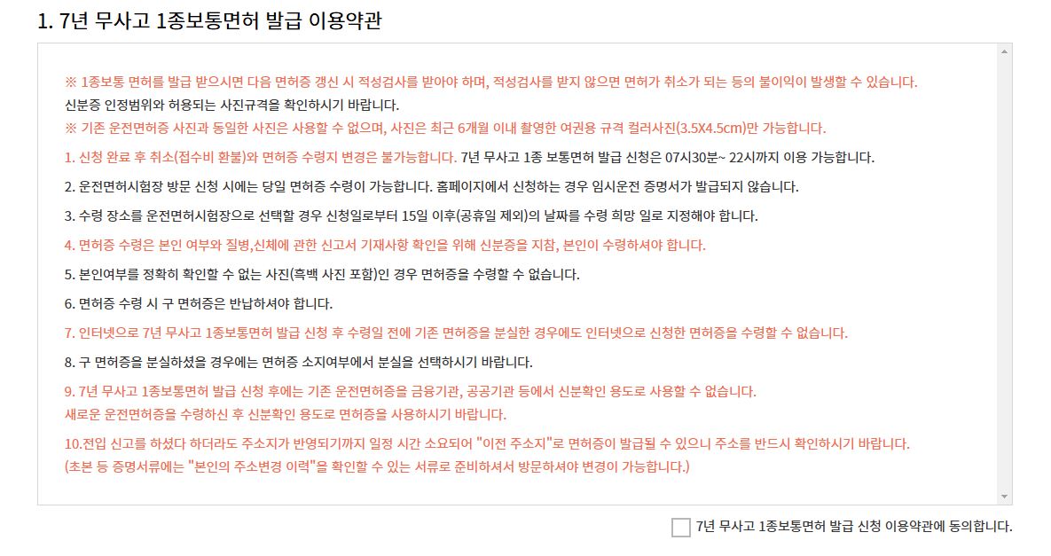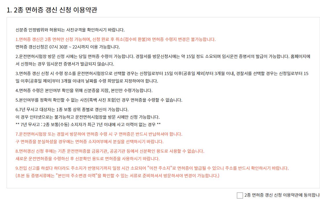 2. 운전면서 적성검사/갱신 온라인 신청 선택후 갱신 이용약관을 동의합니다. 2종 운전면허 갱신의 경우 7년 무사고시 1종 보통면허 발급을 받으실 수 있습니다.