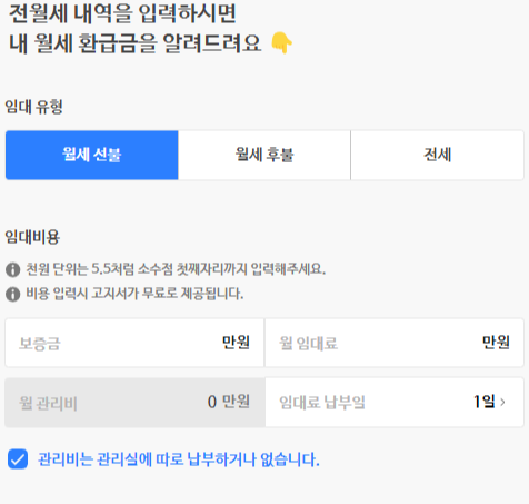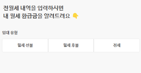 임대 비용과 거주 건물 정보를 입력 임대인 휴대번호를 입력하면 월세 환급액금을 확인할 수 있습니다.
