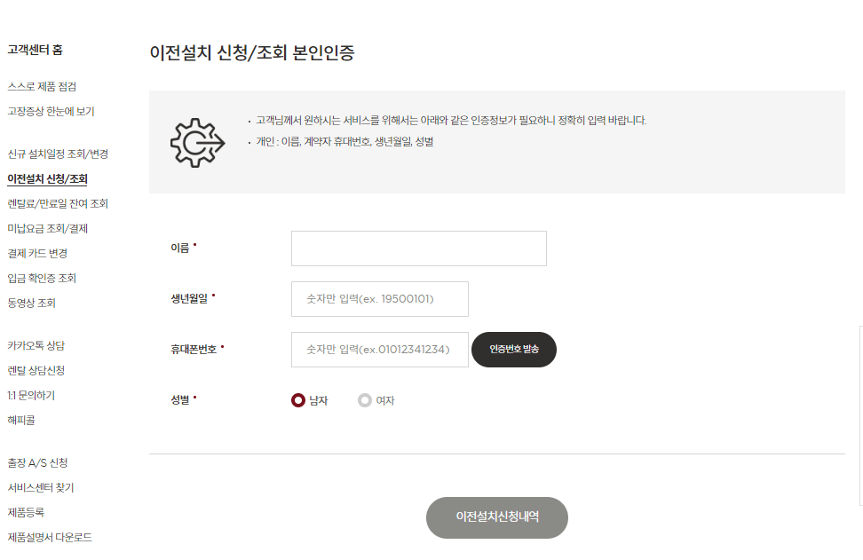 쿠쿠 정수기 이전 설치 시 쿠쿠 고객센터 홈페이지에 로그인을 했어도, 한번 더 이전 설치 신청/조회 페이지에서 본인인증을 해야 합니다.