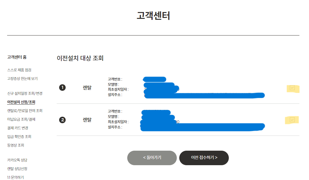 본인인증을 하면 렌탈중인 쿠쿠 정수기 외 모든 제품 리스트 확인이 가능하고, 이전 설치할 제품을 체크해줍니다.