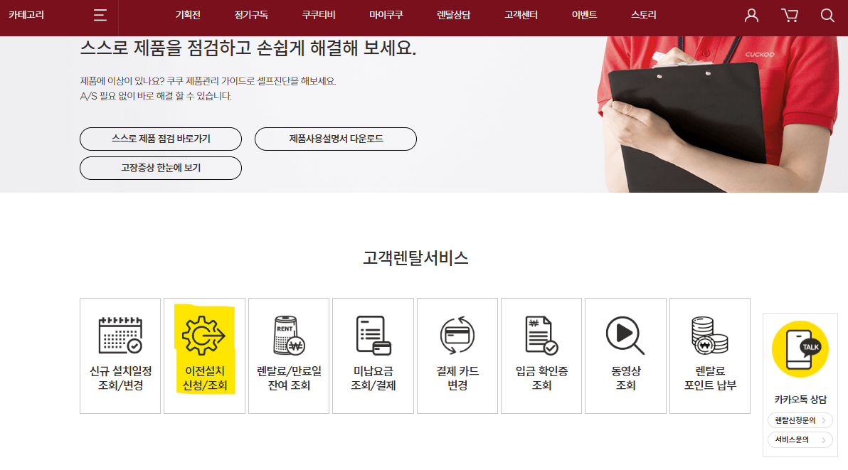 먼저 쿠쿠 홈페이지에 접속해서 고객센터 메뉴의 고객렌탈 서비스 - 이전설치/ 신청 조회를 클릭해줍니다.