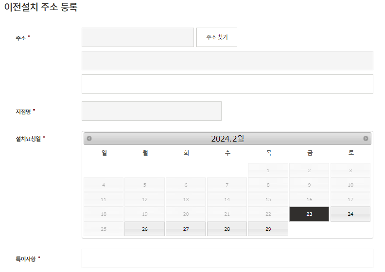쿠쿠 정수기를 이전설치할 주소, 이사가는 곳의 주소를 입력하면 지점명이 자동으로 노출됩니다.
