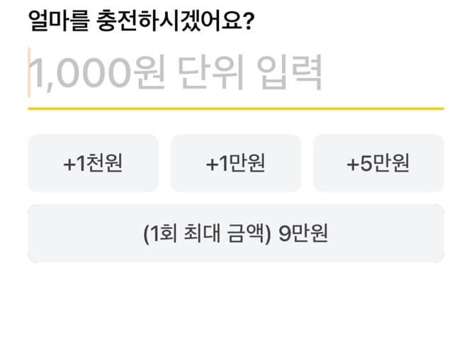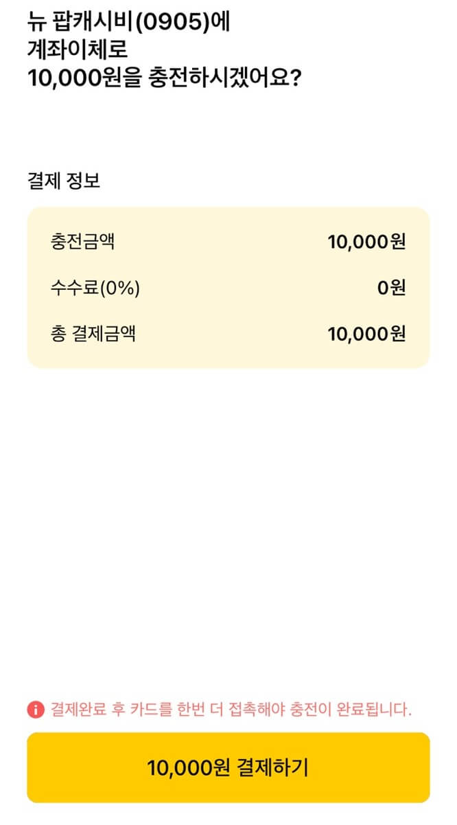 계좌이체 충전이 처음일 경우에는 최초 휴대폰 본인인증과 계좌등록, 비밀번호 등록이 진행됩니다. 결제가 완료된 후 교통카드를 한번 더 휴대폰 뒷면에 접촉하면 충전이 완료됩니다. 계좌 이체의 1회 충전 한도는 최대 20만 원이고, 월 최대 충전 한도는 100만 원입니다.