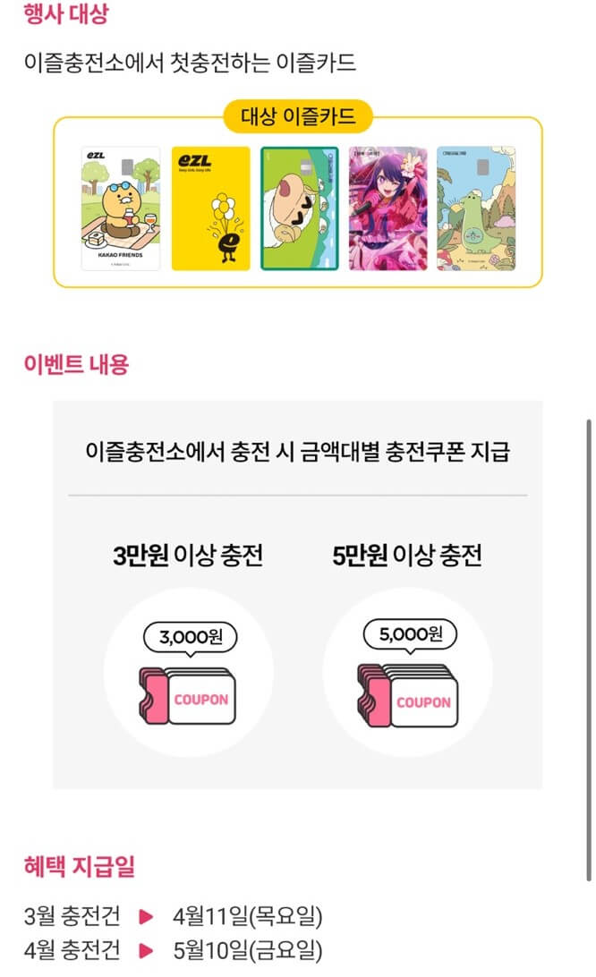 현재 이즐 충전소에서는 첫 충전 이벤트도 진행하고 있으니 처음 캐시비 카드를 구매하고 이즐충전소에 충전을 하신다면 이벤트 혜택도 받아보시기 바랍니다.