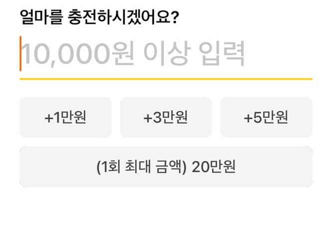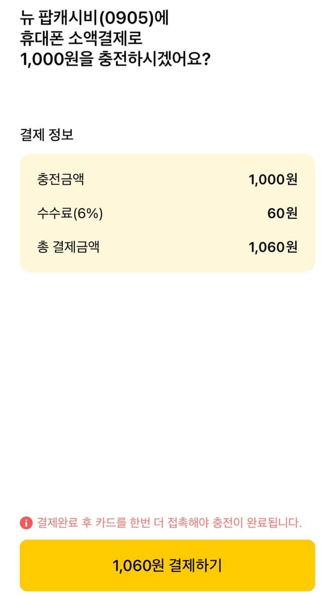 충전을 진행하는 방식은 계좌이체와, 신용카드, 휴대폰 소액결제 모두 동일하며 충전 수단에 따라 결제 진행방식과 수수료가 달라집니다. 휴대폰 소액결제는 1000원 단위로 충전이 가능하지만 수수료는 6%가 발생합니다.