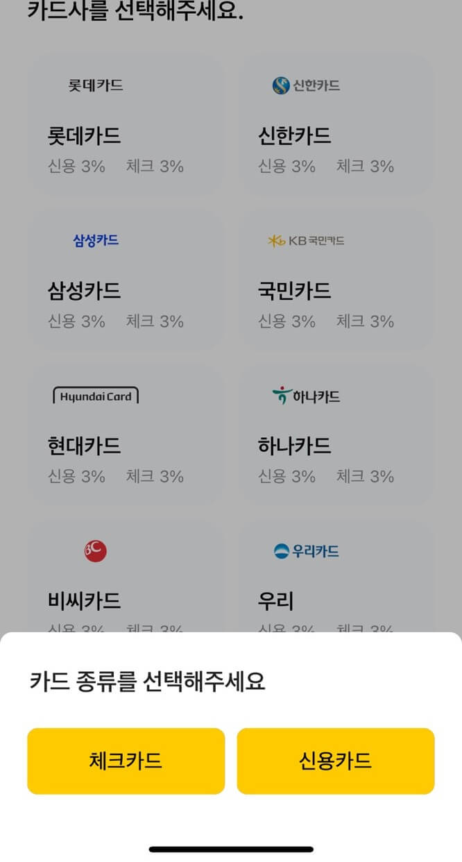 캐시비 카드 충전 수단을 신용카드로 선택할 경우 자신이 보유한 카드사를 선택 후 충전 금액을 입력하고 신용카드 결제를 진행합니다. 충전 수단 카드 조회 후, 충전 수단에서 신용카드로 충전할 경우 수수료가 3%가 발생하며, 1회 충전한도는 최대 9만원 월 최대 충전한도는 100만 원입니다.