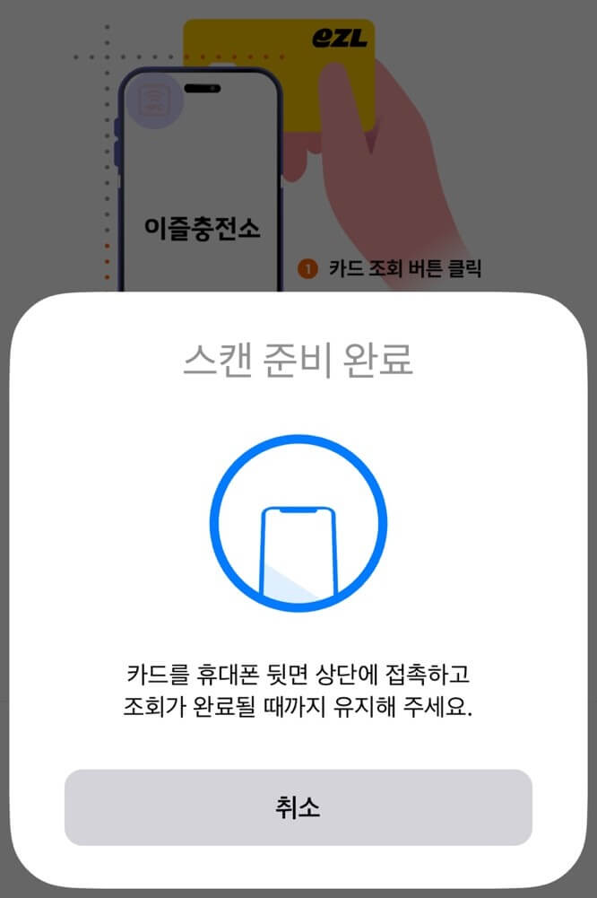 이즐충전소에서 캐시비 카드를 충전하기 위해서는 카드 등록을 진행해야 합니다. 어플 하단 중앙에 있는 카드 조회버튼을 클릭하고 캐시비 카드를 휴대폰 뒷면 상단에 가이드라인에 맞추어 인식이 될 때까지 기다립니다.