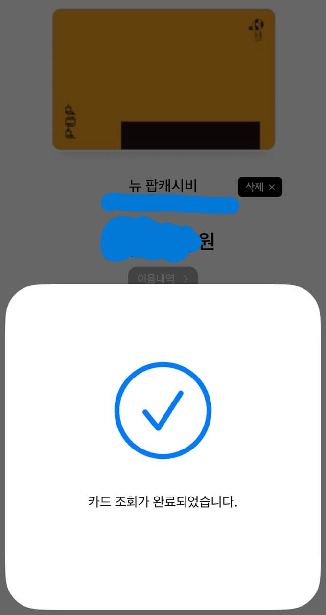 위치가 잘 맞지 않는 경우, 카드를 인식하는데 시간이 걸리지만, 최상단 왼쪽 모서리에 맞추면 캐시비 카드정보가 바로 인식 됩니다.