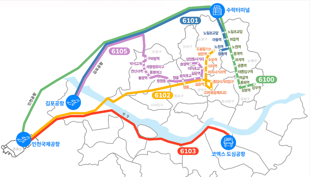 도봉등기소,쌍문역,수유역,미아역,미아사거리역,고려대,종암경찰서,길음역, 정릉 ↔ 인천공항 |
