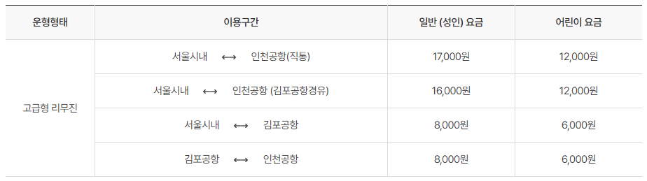 서울시내에서 인천공항을 직통하는 리무진의 경우 일반 요금은 17,000원, 김포공항을 경유하는 노선의 경우 16,000원이며, 어린이 요금은 12,000원입니다.