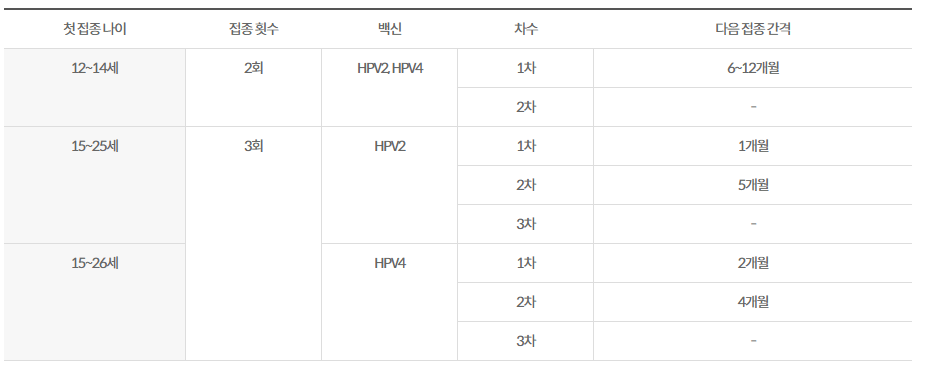 자궁경부암 예방접종은 처음 접종하는 나이와 접종 내역에 따라 달라 질 수 있습니다.