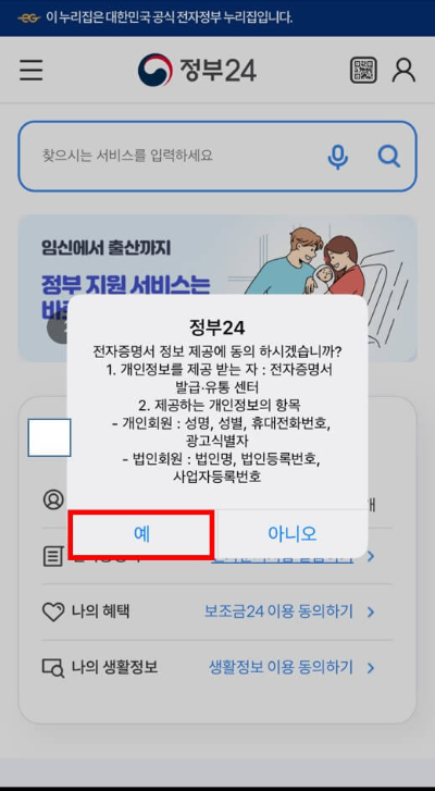 - 전자증명서 정보 제공 동의하기