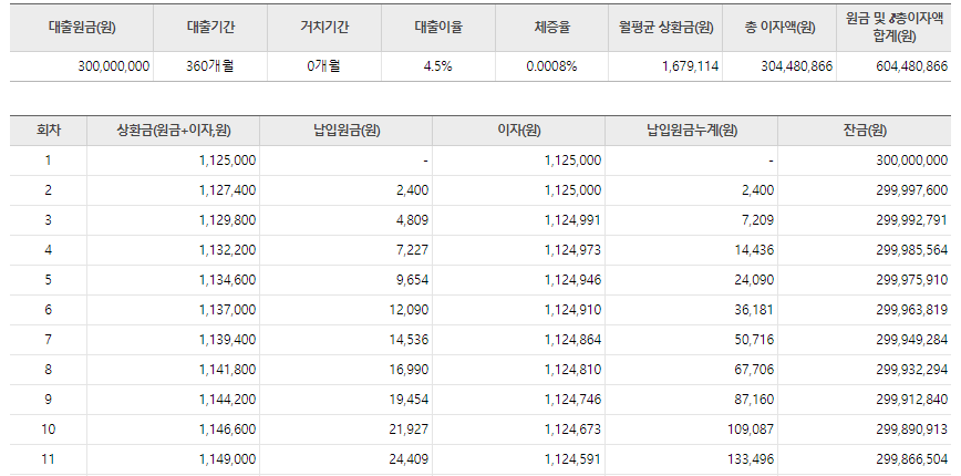 예를 들어, 300,000,000원을 30년(360개월) 동안 4.5%의 이율로 대출받으시면 원리금균등상환 기준 매월 약 1,520,055원씩 상환하시면 됩니다. 총 대출 금액이 3억원이고 총 이자는 247,220,131원이 발생하며, 총 비용은 547,220,131원이 됩니다.