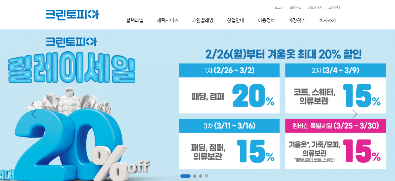 크린토피아에서는 저렴한 가격으로 이용할 수 있도록 정기적인 할인을 진행하고 있습니다. 매주 수요일은 크리닝 데이로 7%, 마트 매장의 경우 수요일 또는 목요일 적용되고 생일인 경우 15% 할인을 받을 수 있습니다. 또한 신학기 기간에는 신발, 가방, 교복 세탁 할인 이벤트와 3월에는 주로 겨울옷을 할인받을 수 있는 릴레이 이벤트가 진행됩니다.