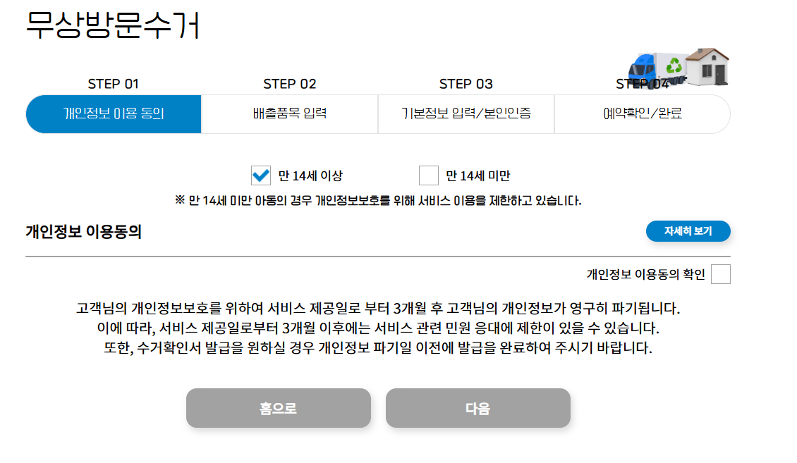 자세히보기 확인 후 개인정보 동의를 선택합니다. 무상방문수거를 요청할 배출 품목들을 선택합니다.