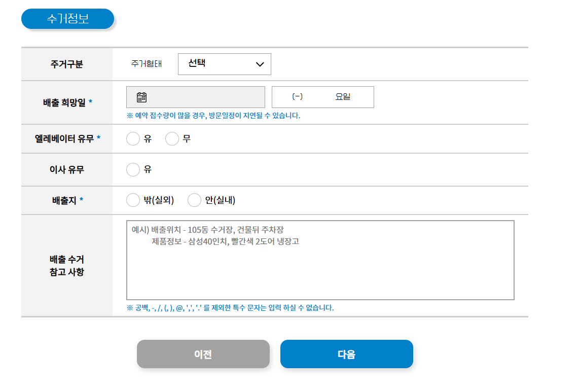 무상방문수거 신청자 기본 정보와 수거 정보를 입력합니다.