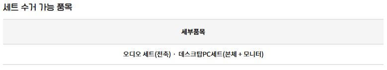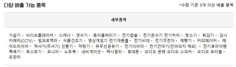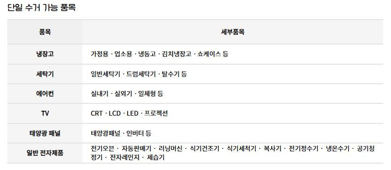다만 일부 품목은 수거 대상에서 제외될 수 있습니다 주요 부품이 빠지거나 심하게 손상된 제품은 재활용이 어려워 수거가 불가능합니다