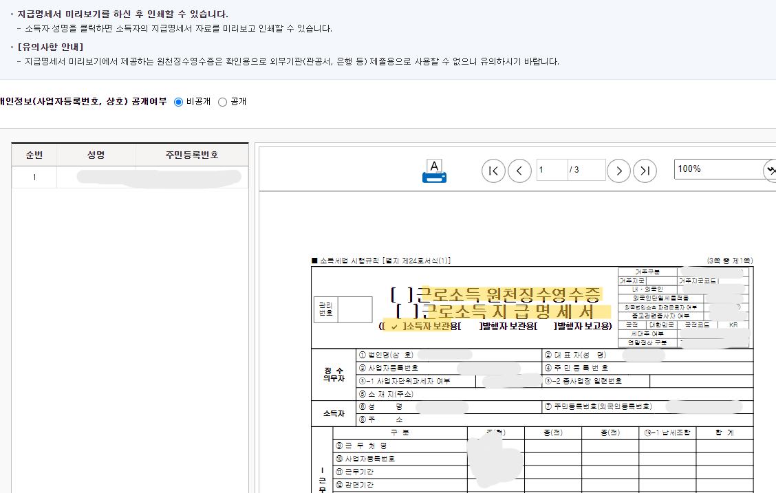 만약 소득자별로 원천징수영수증을 발급받고 싶다면, 소득자 성명을 클릭하면 됩니다. 이 경우에도 소득자의 지급명세서 자료를 미리보고 인쇄할 수 있습니다.
