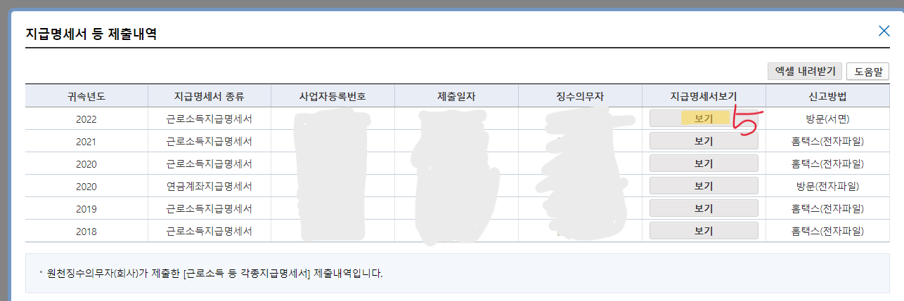 이렇게 하면 원천징수영수증 발급 내용을 확인할 수 있습니다. 인쇄 버튼을 누르면 원천징수영수증을 인쇄할 수 있습니다.