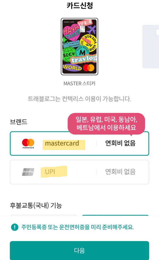 하나 트래블로그 체크카드는 하나 머니 앱에서 신청 가능합니다. 체크카드의 경우 연회비가 부과되지 않고 마스터 카드와 UPI 유니온페이 카드 중 선택가능합니다.
