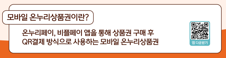 온누리 모바일 상품권은 온누리페이 앱 또는 비플페이 앱을 다운로드한 후, 상품권 권종을 선택하여 구매가능합니다. 온누리 상품권은 5천 원부터 1만 원, 3만 원, 5만 원, 10만 원 단위로 충전 가능합니다. 구매한 온누리 모바일 상품권은 가맹점의 QR을 촬영한 후 금액을 입력 전송하면 결제가 완료됩니다.