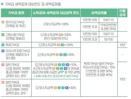 1000만 원 이하의 기부금은 15퍼센트 1000만 원 초과 기부금은 30퍼센트의 세액공제를 받을 수 있습니다 또한 판매 가능한 안 입는 옷이나 도서 등을 기부한 경우에도 세액공제가 가능하며 기부금의 금액은 동일 품목의 평균 단가로 산정됩니다