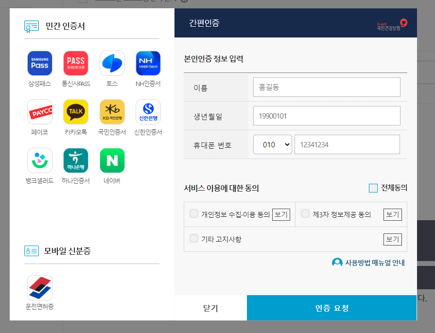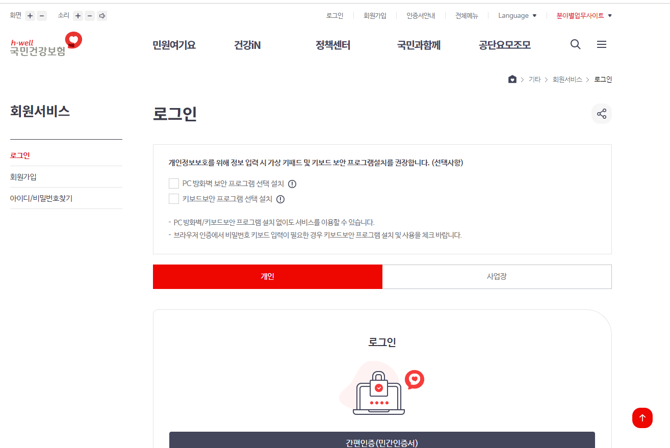 국민건강보험 홈페이지에서 로그인한 후 메인 메뉴에서 검진대상조회를 선택합니다. 로그인은 간편로그인과 공동금융 인증서 로그인이 가능합니다.