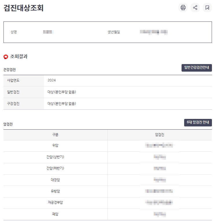 검진대상조회 페이지에는 성명과 생년월일이 표시되며, 조회결과 사업년도와 2024 건강검진 일반검진과 구강검진 대상자 확인이 가능합니다 .