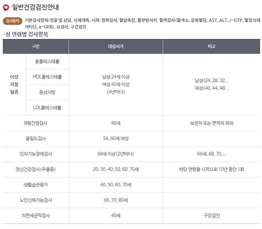 - 기본검사항목: 진찰 및 상담, 신체계측, 시력·청력검사, 혈압측정, 흉부방사선, 혈액검사(혈색소, 공복혈당, AST, ALT, r-GTP, 혈청크레아티닌, e-GFR), 요검사, 구강검진