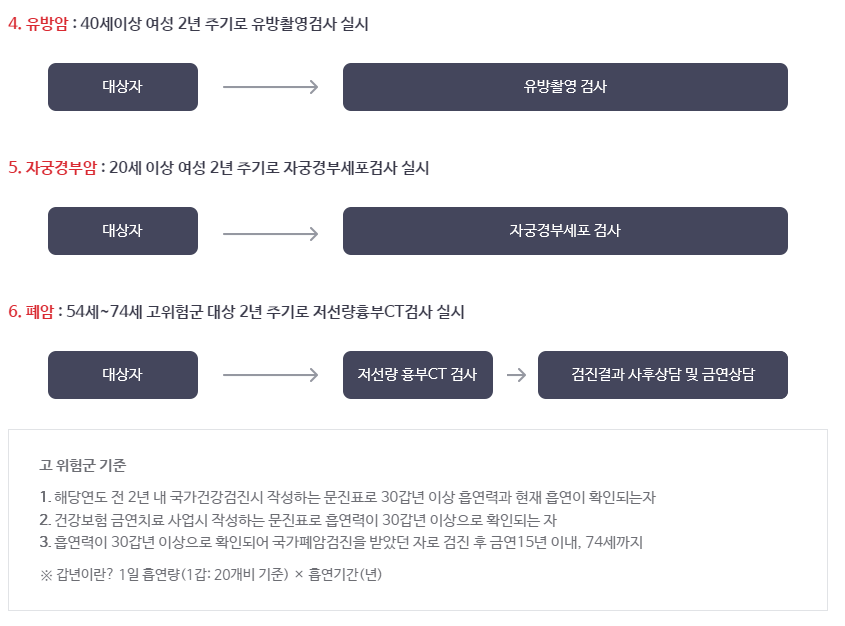 - 폐암 : 54세~74세 고위험군 대상 2년 주기로 저선량흉부CT검사 실시