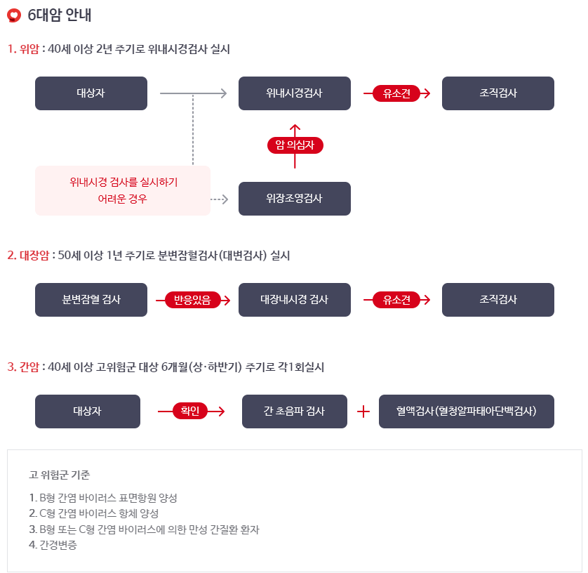 - 간암 : 40세 이상 고위험군 대상 6개월(상·하반기) 주기로 각1회실시