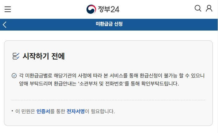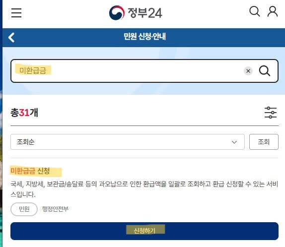 정부24에서는 다양한 기관의 미환급금을 통합적으로 조회하고 신청할 수 있습니다.