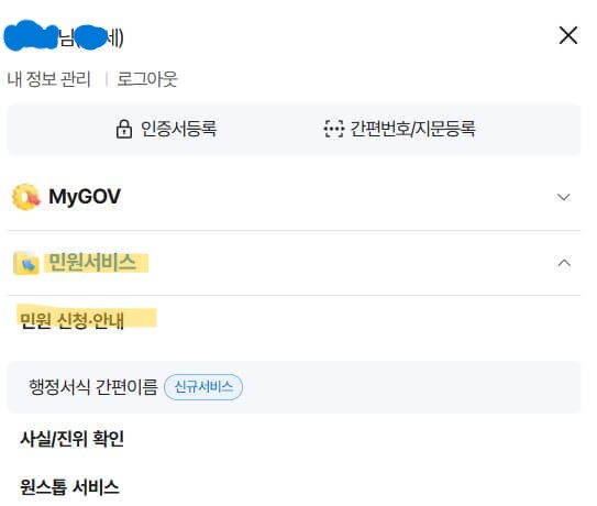 정부24 홈페이지에 접속합니다. 로그인 후 메뉴에서 민원서비스> 민원 신청 안내를 선택합니다.