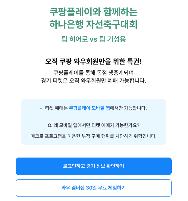 하나은행 임영웅 자선 축구 대회의 티켓은 쿠팡 와우 멤버십 회원만 구매할 수 있습니다.