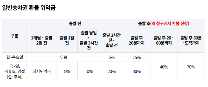 명절 승차권은 일반 승차권보다 취소 수수료가 엄격하게 적용됩니다. 금~일요일, 공휴일과 설날, 명절에는 최저 위약금 400원이 부과됩니다.