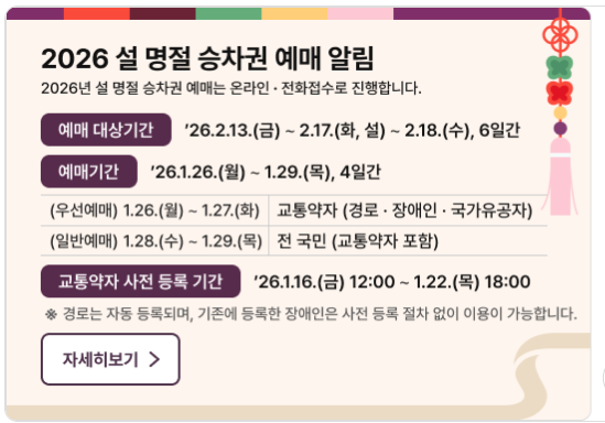 매년 설 명절에는 예매 시기를 놓치면 이동이 어려워지는 만큼, 2026년 설날 기차표 및 고속버스 예매 일정과 취소 수수료를 미리