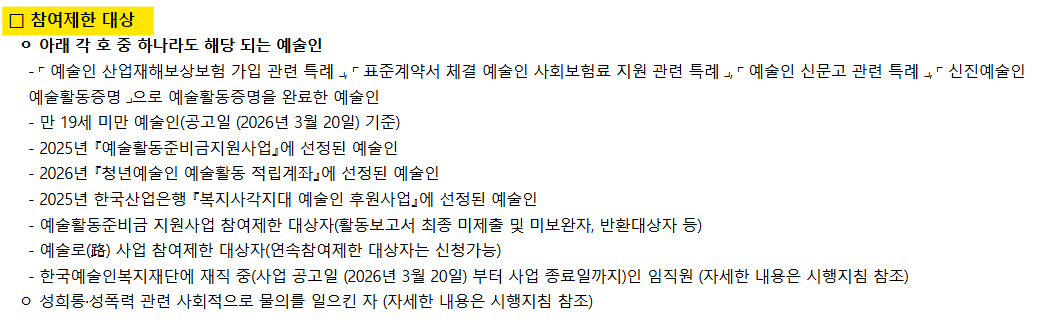 - 예술활동증명 보유: 공고일인 2026년 3월 20일 기준으로 유효한 증명을 보유해야 합니다. (외국인 참여 불가)