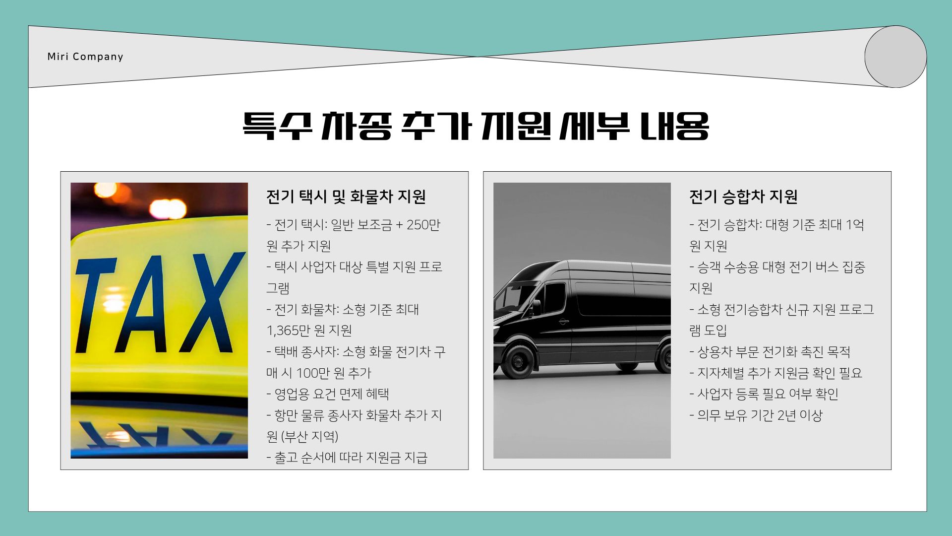 - 전기 택시: 일반 승용차 보조금 + 250만 원 추가 지원