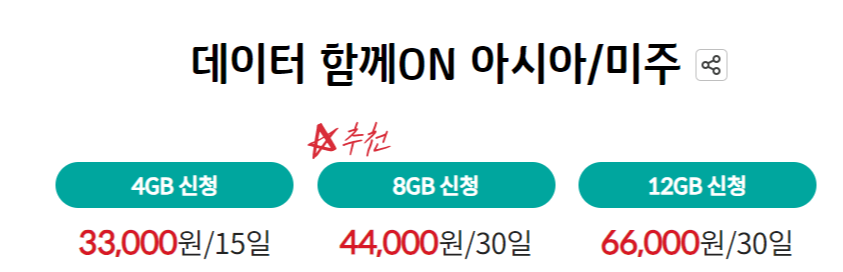 충전시 6,600 원 / 1GB 7,700 원 / 1GB 지원국가 아시아/미주 지원국가 46개국