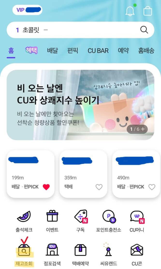 포켓 cu앱 메인에서 재고 조회 메뉴를 선택합니다.