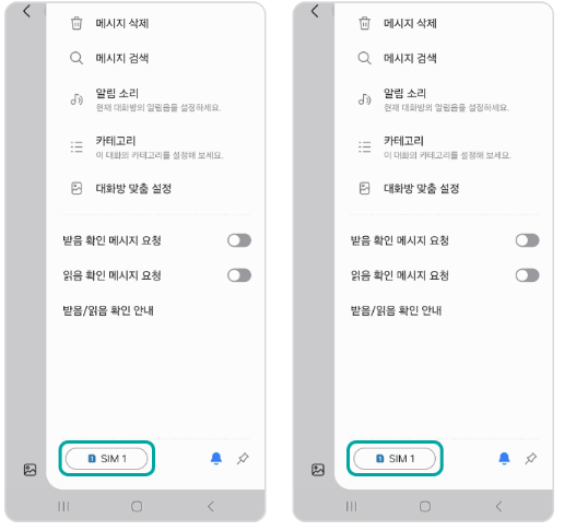 전화 통화의 경우 인디케이터에서 SIM/eSIM 선택이 가능합니다. 문자 메세지는 오른쪽 점 3개를 터치해서 왼쪽 아래 사용 SIM을 변경하면 투넘버로 문자 메세지 발송이 가능합니다.