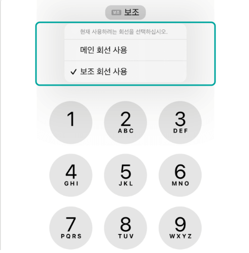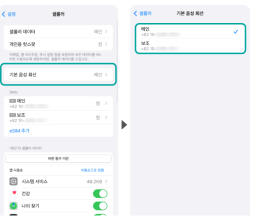 아이폰 투넘버 전화 발신은 설정>셀룰러 메뉴에서 기본 음성 회신 메뉴에서 메뉴 또는 투넘버(보조)를 선택해 줍니다. 또는 전화 발신 시 키패드 위쪽 메뉴에서 메인 또는 보조 번호로 선택 가능합니다.